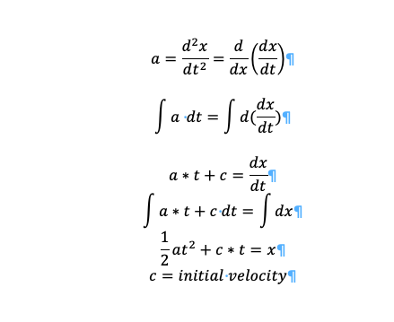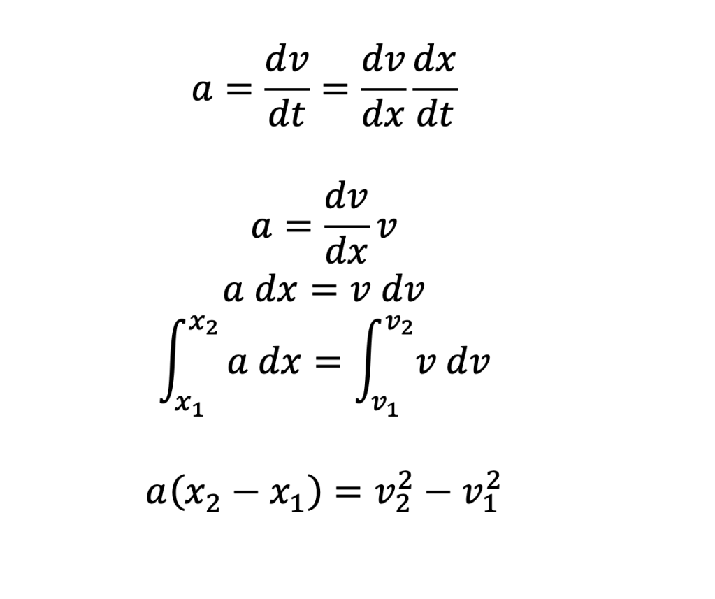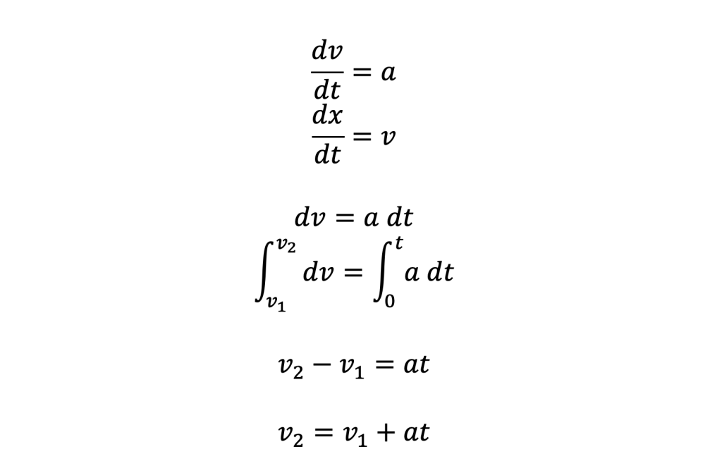 The first and second equation are the definition of acceleration and velocity respectively. The solve the equations we had to use integration which I will touch on a little late. The final result is how velocity, acceleration and time all relate to one another. There are a few more equations that need to be derived we can use the chain rule to get position.